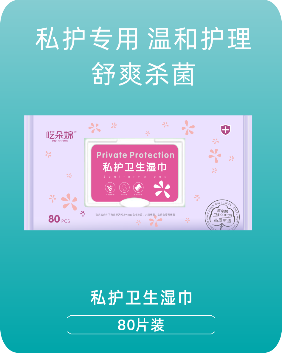 私护卫生湿巾,让更多的女性朋友,远离妇科困扰,提高女性生殖健康养护意识。通过日常清洁保养,来预防妇科问题,私护专用,温和护理。