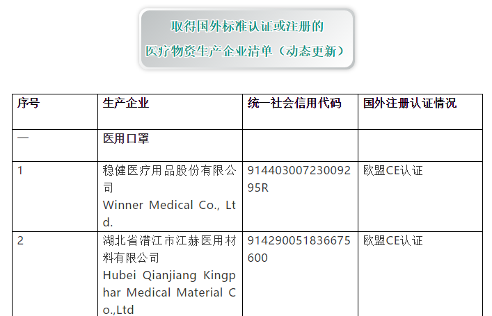 医保商会推出取得国外标准认证或注册的医疗物资和非医用口罩生产企业清单